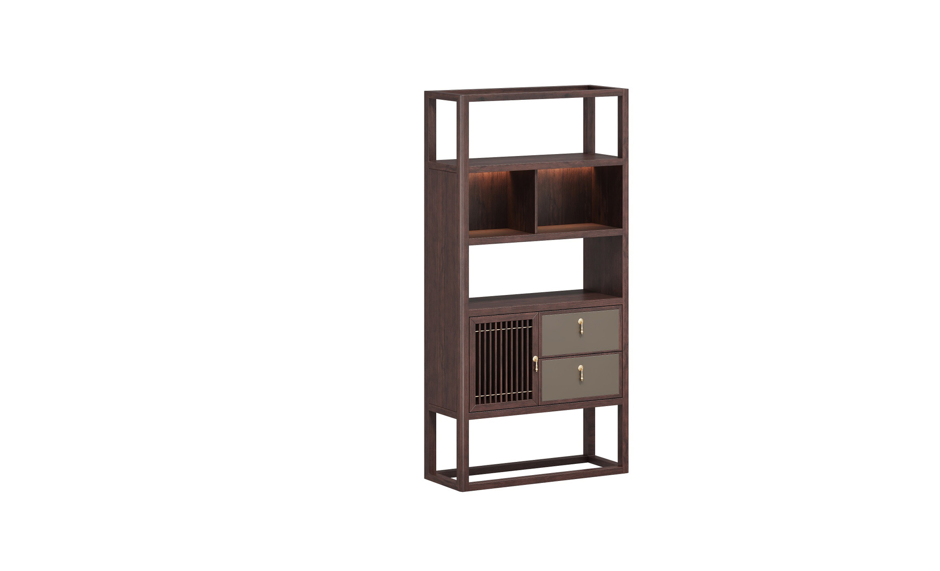 挡板圆型设计,金铜件装饰,铜木结合,镂空竖条元素的原木栅格设计,凸显中式与现代的融合韵味。