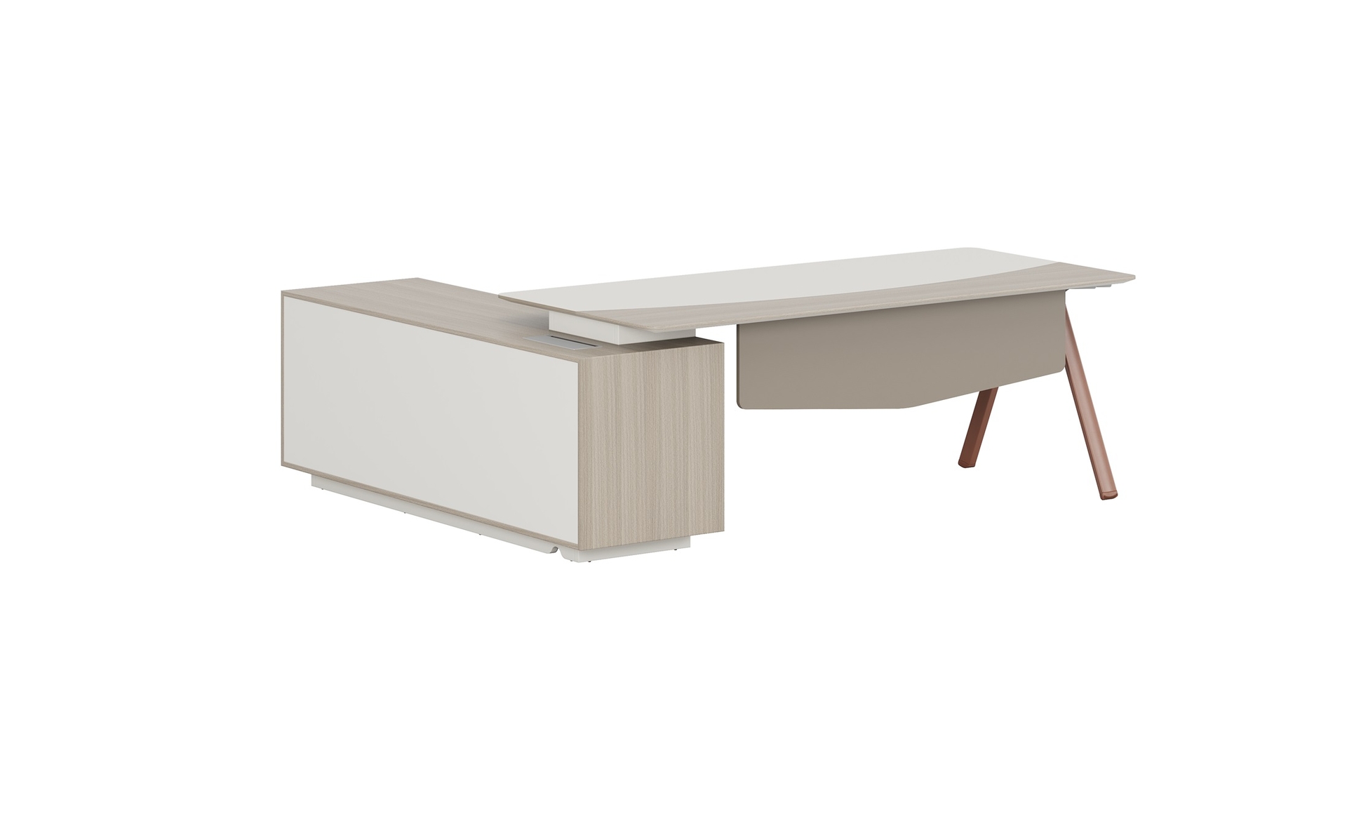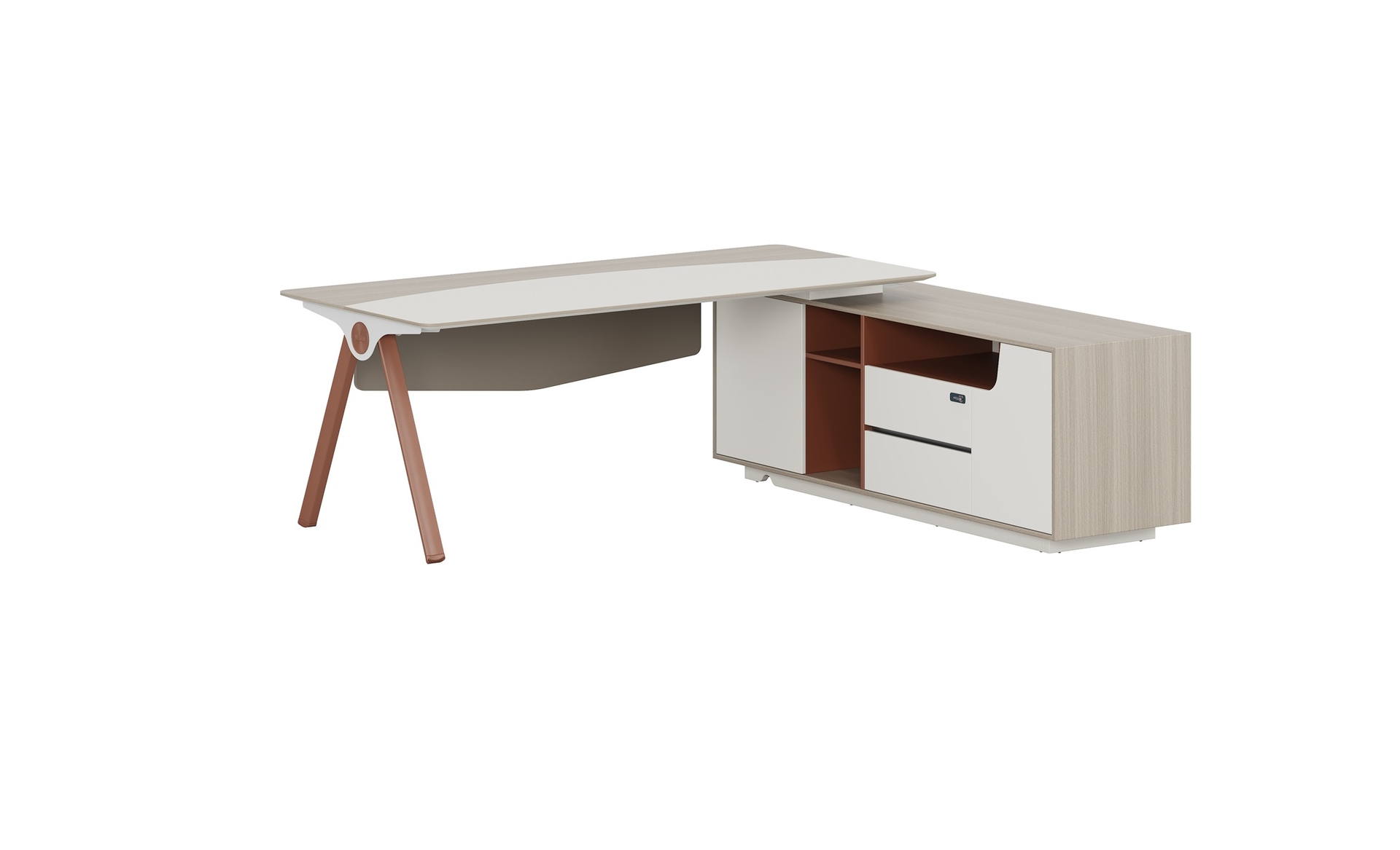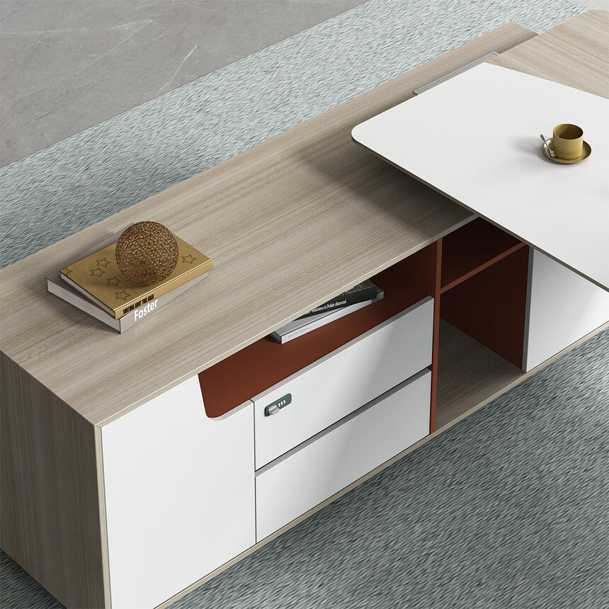 优格又名“有格”,代表了有品格、有格调。产品整体以“青春、时尚、动感”为设计主题,采用了大量的弧形与直线条交叉设计,将产品魅力展示的淋漓尽致。在一贯沉稳的深色办公配色中,大胆运用了白色、卡其棕色与浅色木纹的撞色搭配,打破产品配色原有的严肃氛围,赋予了产品生命力以及活力。独特的台脚与桌屏设计,动感十足,无不展示产品的细节之美。产品设计时尚,配置齐全,适合各种规模的办公场所。