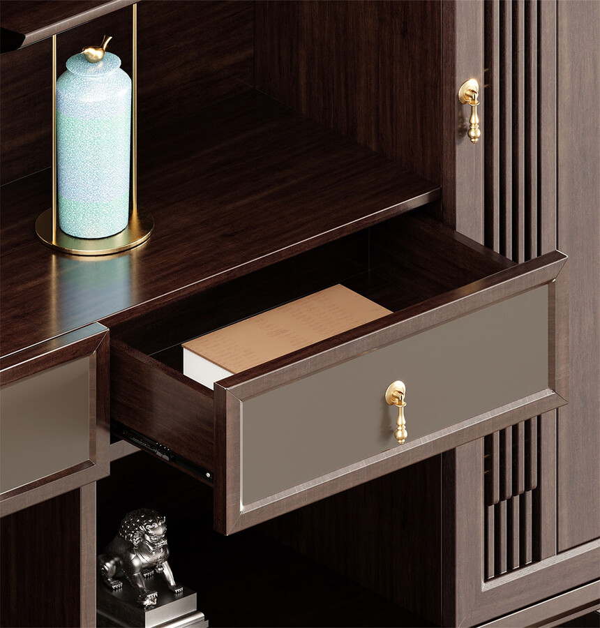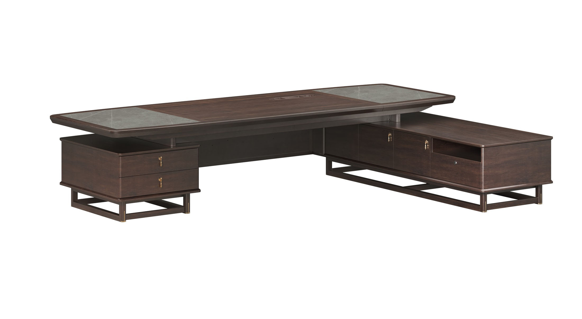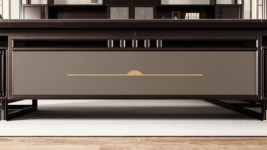 鸿泰系列是一款新中式风格的办公家具,设计灵感源于中式传统装饰纹样“回”字形,因其形式回环反复,延绵不断,在民间有“富贵不断头”的说法,有连绵不断、吉利长久的吉祥寓意,在造型上主要采用硬朗简洁的直线条,温润的乌金木与质朴的岩板相结合,刚柔并济,时尚大方,既使得中式家具古典、质朴的内涵显现,又符合现代办公追求的时尚感、实用性。